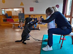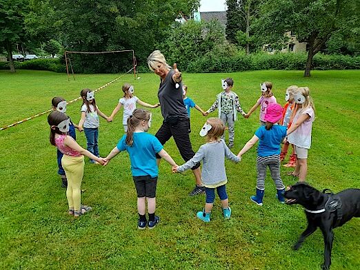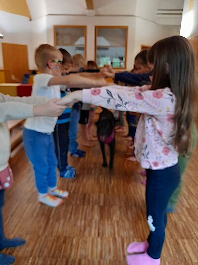 Unsere gemeinsame Ausbildung starteten wir schon sehr früh. Angefangen mit einer Welpenschule, in der Ella alle grundlegenden Verhaltensregeln lernte, die junge Hunde kennen sollten. Parallel dazu übten wir kurze Gewöhnungszeiten im Kinderhaus, damit der Hund alle Geräusche und Gerüche, die ein Kinderhausleben mit sich bringt, kennenlernt. Dann folgte das Lernen in der Junghundeschule und im Jahr 2019, mit entsprechendem Alter, starteten wir die Ausbildung zum Begleithund und beendeten diese mit einer erfolgreich absolvierten Prüfung. Damit der Einsatz im Kinderhaus gelingen konnte, absolvierten wir im Anschluss eine zweijährige zertifizierte Ausbildung zur Tiergestützten Pädagogik, die wir ebenfalls mit einer bestandenen Abschlussprüfung beendeten. Seither ist Ella regelmäßig im Einsatz. Zusammen sind wir ein gutes Team, das schon viele gemeinsame Einsätze mit unterschiedlichsten Kindern- und Kindergruppen im Haus und in den Waldwochen begleitet hat.